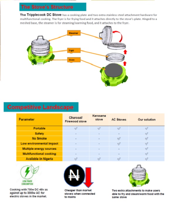 The Tripplecook model is the newest in the Nicost range of DC cooking stoves, and the design is ongoing. It is a 700W DC 48v cooktop with three cooking functions, and it cooks at a fraction of the cost of regular AC220v electric stoves in the market. The stove has a cooking plate and two extra stainless steel attachment hardware for multifunctional cooking. One attachment is for frying food, and the other is for steaming/warming food. Both hardware can be attached and detached from the stove’s plate according to the user’s needs. The Tripplecook particularly enables users to conserve cooking space, minimise investments on cooking utensils, and allow the use of one device to cook various types of dishes. Like all other Nicost stoves, the Tripplecook stove can cook from multiple sources, including renewables and batteries.